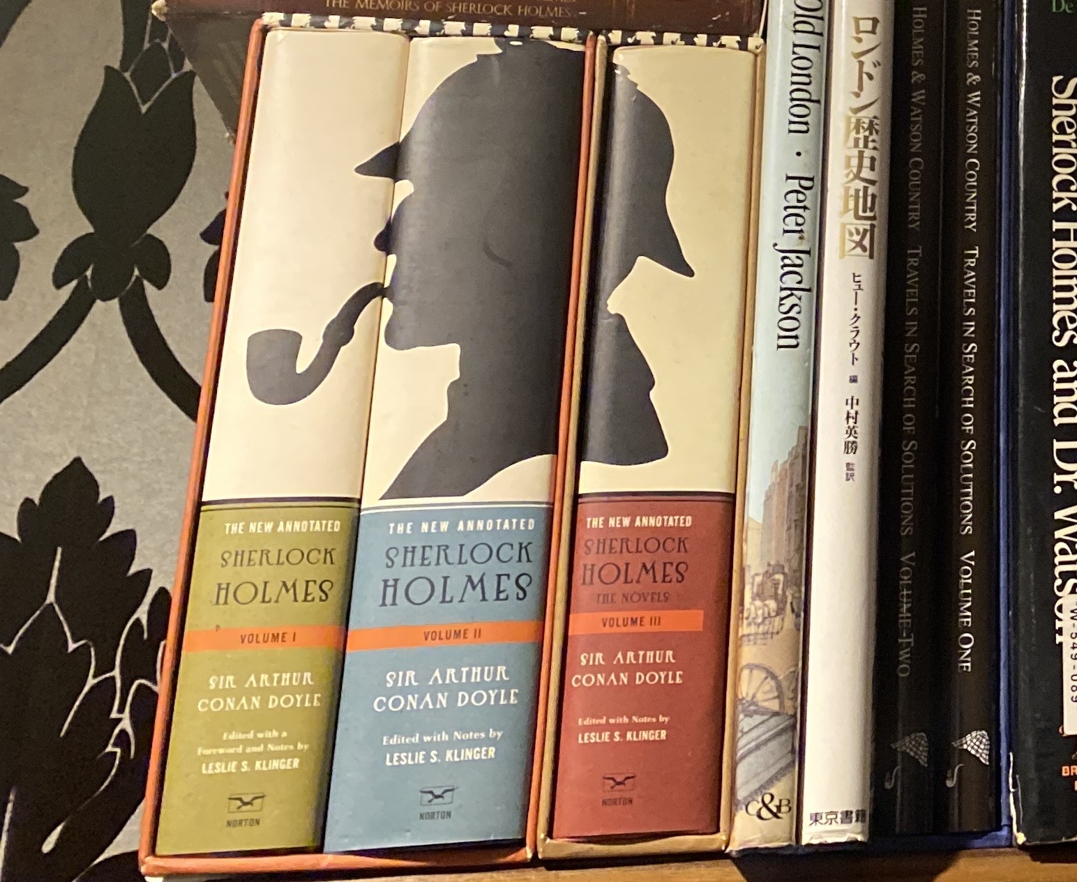 冒頭の写真は私のささやかな書斎にある『New Annotated Sherlock Holmes』。いわゆる鈍器本ですが、机の上の高いところに保管しているので、地震で落ちてこないかが心配です。