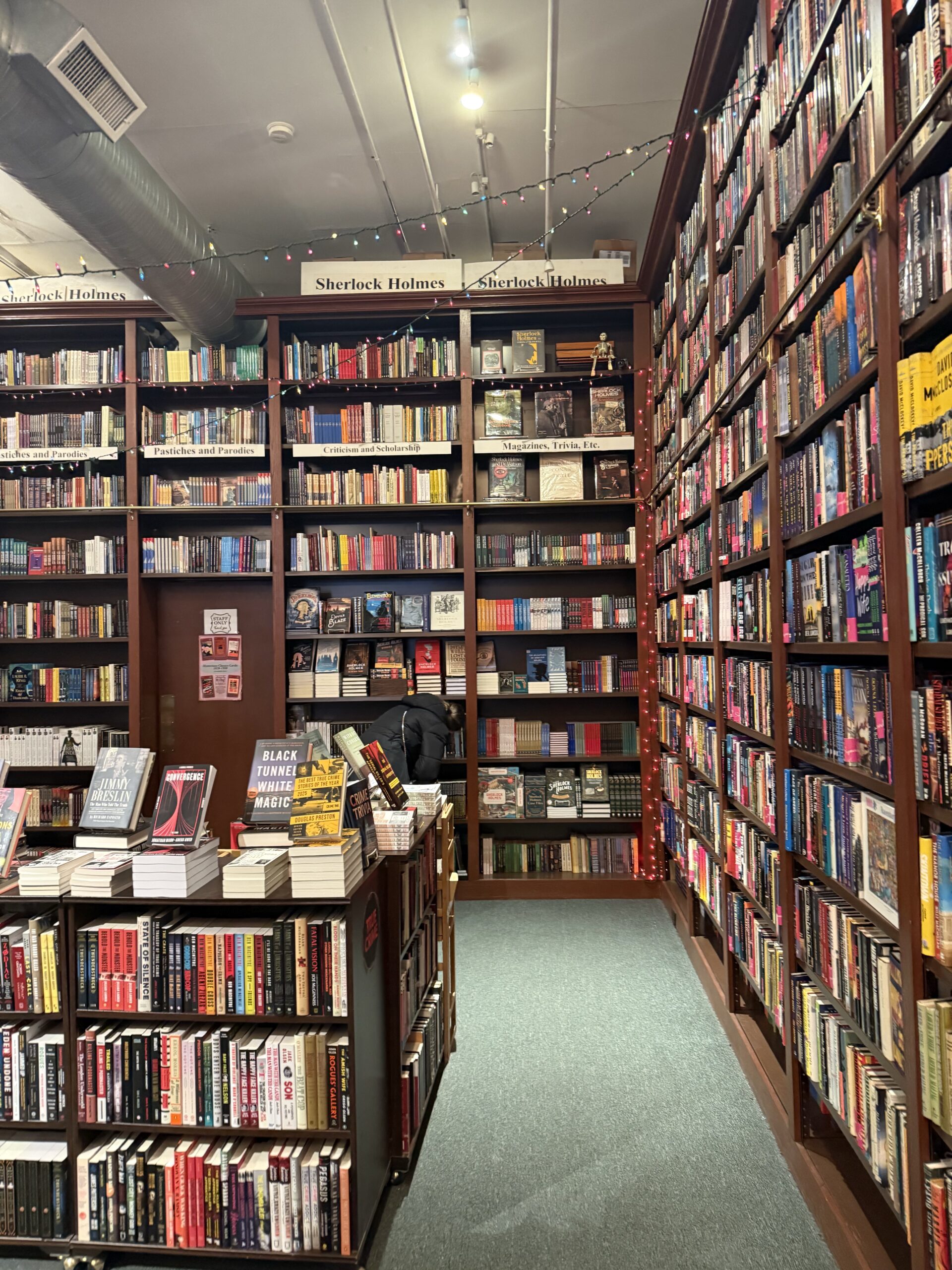 冒頭の写真は、ミステリアスブックショップの1階。奥の壁一面がホームズ本となっています。